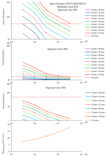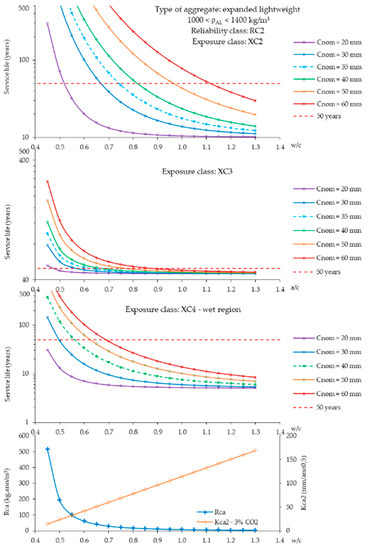 However, despite some examples of good performance, knowledge on the durability behavior of SLWAC is still scarce and the mechanisms of deterioration are less dominated than in conventional NWC. Nowadays, due to its more porous nature, SLWAC is still simply seen as less durable than NWC, regardless of the type of aggregate and concrete composition. For this reason, some normative documents conservatively suggest poorly substantiated thicker concrete covers for SLWAC than for NWC, for a given strength level, without accounting for the concrete type and deterioration mechanism [18,19,20]. Moreover, prescribed compositions by the main European standards for a required service life are only defined for NWC or roughly adjusted to SLWAC, without a broad experimental basis [21,22]. As a result, the durability and service life assessment of SLWAC have been the subject of intensive research during the last years, which contributes to a greater confidence in using SLWAC.