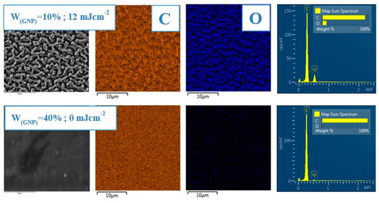 Selected EDS element distribution maps of C and O on PS polymer treated with a laser fluence value of 12 mJ·cm−2 (6000 pulses), doped with 10% GNP and non-modified with 40% GNP. View field of 30 × 30 μm2.