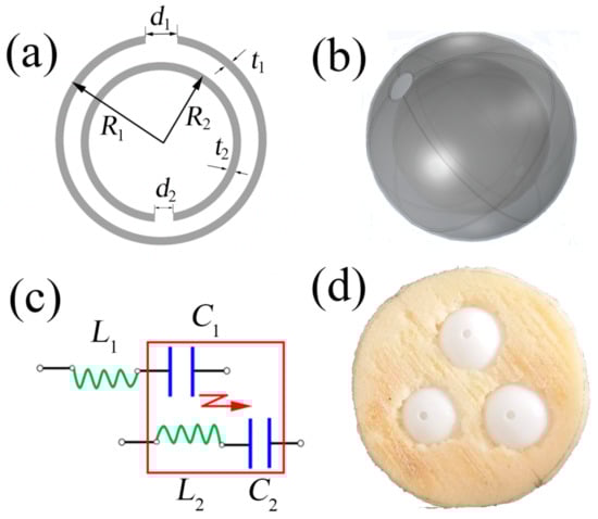 SRR is a kind of magnetic resonance structure for designing EMMs. Considering that AMMs are analogous to EMMs, we designed an NSHS structure with the same 2D schematic as SRRs (Figure 1a). The NSHS structure was an acoustic resonance structure composed of two SHSs with the same ball centre, as shown in Figure 1b. R1, t1 and d1 are the radius, thickness and split hole diameter of the exterior SHS, respectively. R2, t2 and d2 are the radius, thickness and split hole diameter of the interior SHS, respectively. The NSHS was 3D printed using a photosensitive resin (PSR) with a thickness of 0.5 mm. As the acoustic impedance of PSR is much larger than that of air, the sphere shell could be considered an acoustically rigid medium. According to the lumped circuit model, the NSHS microstructure could be analogous to two inductor–capacitor (L–C) circuits with mutual inductance, as shown in Figure 1c. The hollow sphere cavities of two SHSs function as acoustic capacitors, that is,