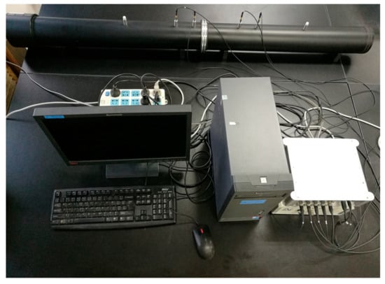 A sponge matrix with a diameter of 100 mm and a thickness of 40 mm was used to fabricate the NSHS-AMM in the experiment. The unit cell of the NSHS with a lattice constant of 45 mm was arranged in the sponge matrix to fabricate the NSHS-AMM. Figure 1d presents the physical image of the sample. The sphere radii of the NSHS were R1 = 20 mm and R2 = 15 mm, and the diameters of the two split holes were d1 = 6 mm and d2 = 3 mm. Two kinds of SHS-AMMs were fabricated by filling the SHS structures instead of the NSHSs to investigate the transmission characteristics and compare them with the transmitted results of the NSHS-AMM. The first SHS-AMM consisted of three SHSs with the same size as the internal SHS of the NSHS. The second SHS-AMM was composed of the three external SHSs of the NSHS. The two different sized SHS structures were designed with the same resonant frequency according to Equation (7). When the two SHS structures are used to design NSHS, the two shifted transmission dips will clearly illustrate the characteristics of coupling resonance. All samples were measured in an impedance tube testing system. The testing equipment (Figure 2) consisted of an impedance tube which had a diameter of 100 mm, four microphones, a power amplifier, a data-collecting analyser, a computer, and some data cables.