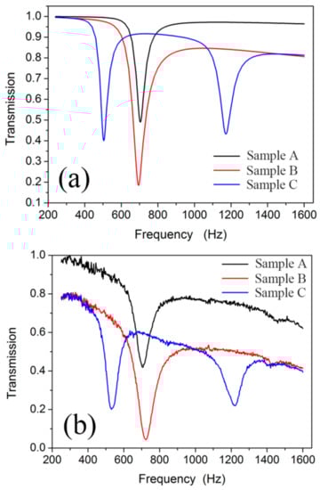 The simulated transmission results of the NSHS-AMM and two SHS-AMMs are shown in Figure 3a. Each SHS-AMM only presents one transmission dip near the resonant frequency of 700 Hz because of the weak interaction between the adjacent SHSs [13,33]. By contrast, the NSHS-AMM presents two transmission dips at 504 and 1172 Hz. In Figure 3b, the experimental transmission curve of the NSHS-AMM shows two dips located in the frequency of 532 and 1222 Hz. Each SHS-AMM presents a transmission dip near 700 Hz. All transmission results of the three samples in the experiment are in good agreement with the simulation results. The difference between the simulation and the experiment is attributable to machining errors. The transmissions in Figure 3 were normalized by the ratio of transmitted sound to incident sound in the experiment and the simulation. As the thermal viscosity loss of the acoustic medial increases with increasing frequency, there will be more sound absorption in the higher frequency which will lead to decreased transmissions of samples in the non-resonant frequency region.