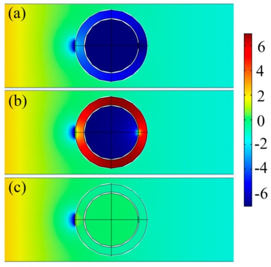 Although the NSHS consists of the two resonant structures of the SHS samples, the two dips are not in the resonant bands of the two SHSs. We calculated the acoustic field distribution in the waveguide to illustrate the problem and present the results in Figure 4. In the frequencies of the two dips (504 and 1172 Hz), the NSHS can store strong acoustic energy and release it from the two split holes, which means resonance in the structure. Figure 4a indicates that the maximum negative pressure is distributed into the interior cavity in the first dip, representing the resonance of the interior SHS. Figure 4b shows that the maximum positive pressure is distributed into the exterior cavity in the second dip, representing the resonance of the exterior SHS. In the non-resonant frequency of the NSHS (1900 Hz), the pressure is nearly equally distributed throughout the entire domain, as shown in Figure 4c. Obviously, this condition is attributed to the coupling effect in the NSHS structure which can affect the resonant frequency band. The coupling in the NSHS results in the redshift of the interior resonance. The exterior sphere shell causes the released energy to oscillate back and forth between the interior split hole and the shell, thereby extending the effective length of the interior SHS. Equations (4) and (6) show that the resonant frequency of the interior SHS can shift to a low frequency. As the interior SHS decreases the effective cavity volume of the exterior SHS, the resonant frequency of the exterior SHS may also cause a blue shift, as shown in Equations (1) and (7).