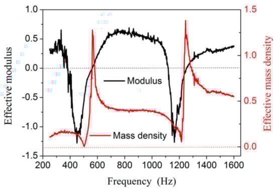 Then, we can calculate the effective mass density and modulus of the NSHS-AMMs from the experimental transmission and the reflection coefficients (Figure 5). The NSHS-AMM presents two bands with a negative modulus near the resonant frequency, and the mass density is always positive. Therefore, the NSHS-AMM is a type of dual-band AMM with a negative modulus.