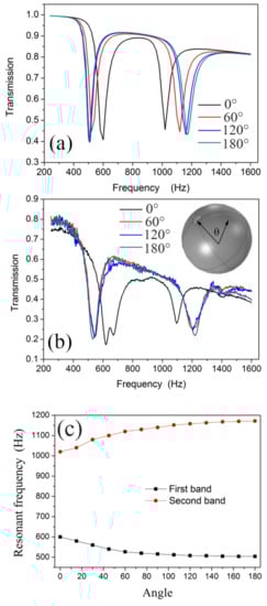Given the complex coupling of the two sub-resonators in the NSHS, the NSHS-AMM with a dual negative modulus band exhibits abundant tuneable properties. The inset in the upper right corner of Figure 6b shows the directional angle θ between the two split holes in the NSHS. The experimental sample discussed in Section 3.1 has the angle θ of 180°. When the directional angle θ increases from 0° to 180° with an interval of 60°, the four NSHS-AMMs present two transmission dips in the simulation and the experiment, as shown in Figure 6a,b, respectively. It is noted that the NSHS-AMM with a 0° angle presented a fluctuation in the first dip of 600–700 Hz, which is attributed to the machining error. When one NSHS with a 0° degree is machined with deviation, its resonant frequency will shift to another band. As there is weak interaction between the units, the sample will present two transmission dips as a fluctuation in the first dip band. The simulated and experimental results agree well with each other. We also simulated the dip frequency distribution of the sample with θ span of 15° (Figure 6c). The figure shows that the two dips had negligible frequency shifts because angle θ was larger than 60°. However, the two dips evidently shifted when angle θ was lower than 60°. All the dip depths were similar to one another. The two split holes in the NSHS with an adequately large distance exerted a negligible effect on the coupling resonance of the AMM. However, when the two split holes were close to each other, the coupling effect evidently produced dual resonant frequency shifts (the first dip moves to the high frequency, and the second dip moves to the low frequency). Therefore, we attribute the simulated and experimental results to the oscillation coupling of the released energy from the two split holes. When the two split holes were close to each other, the oscillation coupling of the released energy from the two split holes was strong.