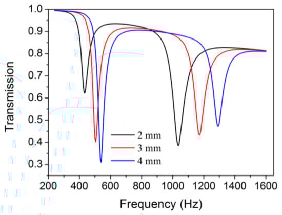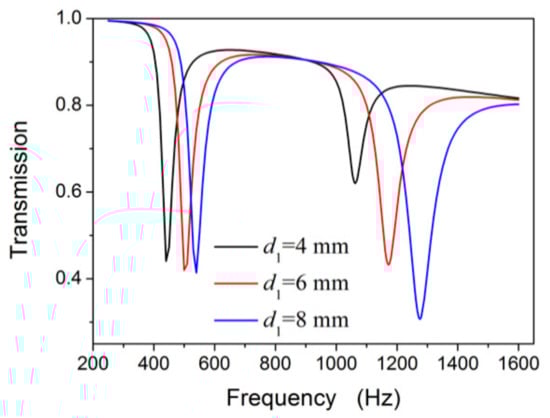 Given that the simulated results are in accordance with the experimental results (Section 3.1 and Section 3.2.1), we investigated the results via simulation. We first studied the effects of the diameter of the external split hole d1 to further investigate the coupling effect and the tuneable transmission dips of the NSHS-AMM with different geometry sizes. The other parameters were set to be the same as those in Section 2. Figure 7 shows the transmission results of the three types of NSHS-AMM with d1 of 4, 6 and 8 mm. The three NSHS-AMMs show two transmission dips which move to high frequencies as the parameter d1 increases. The frequency shift range of the first dip is less than that of the second dip. This also indicates that the depth of the second dip becomes deeper, whereas the depth of the first dip shows a negligible change as the parameter d1 increases. The results illustrate that d1 mainly affected the frequency band of the second dip because of the resonance of the external SHS. As the increased d1 adds more released energy to oscillate in and out of the cavity, the resonance of the external sub-resonator can be enhanced, and the transmission dip deepens further.