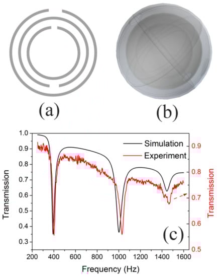 According to the results in Section 3.2, the geometry size of the NSHS affect resonant coupling and the transmission dips. We further designed a structure of a three-nested SHS (TNSHS), as shown in Figure 9a,b. To fabricate the TNSHS structure in an experiment by the 3D printing method, the interior two SHSs were designed from the structure of the NSHS, as discussed in Section 3.1. In this structure, we only changed the split hole’s diameter d2 to 5 mm and the thickness of sphere t1 and t2 to 0.7 mm. The exterior SHS had a sphere diameter of 50 mm, a sphere shell thickness of 1 mm and a split hole diameter of 10 mm. The directional angle between the adjacent split holes was 180°. Using the simulated method in Section 2, we calculated the transmission curve, which is the black curve shown in Figure 9c. The NSHS-AMM show three transmission dips related to the resonance of the three sub-resonators of the SHSs. From Figure 9c, the red curve is the experimental transmission curve, which agrees very well with the result in simulation. The three dips indicate the three bands with negative moduli. This kind of NSHS-AMM has a negative modulus in three bands. If we were to design an n-nested SHS structure (n may be equal to four or more), the n-band AMM with a negative modulus could be fabricated with only one type of structure. This method gives us another choice for designing broadband AMMs.