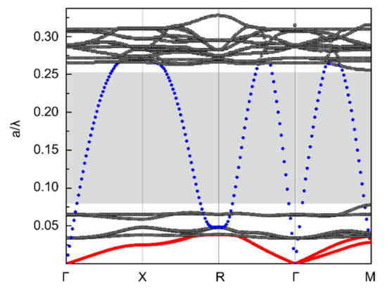 Phonon band structure of the pentamode structure (with geometrical parameters D/a = 2/37.3 and d/a = 0.5/37.3). The first two branches emphasized using red dots and the third using blue dots represent, respectively, are two transverse wave modes and a longitudinal wave mode. The light grey region is the single-mode band gap, in which only the longitudinal wave can propagate.