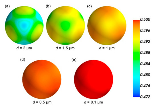 Then, to check the isotropy of the new structure, we plotted the direction dependence of the Poisson’s matrix of the pentamode structure with the periodic boundary conditions imposed on the unit cell in Figure 3. The Poisson’s ratio (matrix here) is proportional to the length of the vector from the origin to the depicted surface. In general, the Poisson’s ratio of the ideal pentamode approaches 0.5, and the Poisson’s ratio of this structure, as shown in Figure 3, is in the range from 0.472 to 0.5. What is more, the difference of Poisson’s ratio for different directions is minimal. The result shows that becomes more and more isotropic when d decreases, leading to the ultimate limit of 0.5 (ideal pentamode).