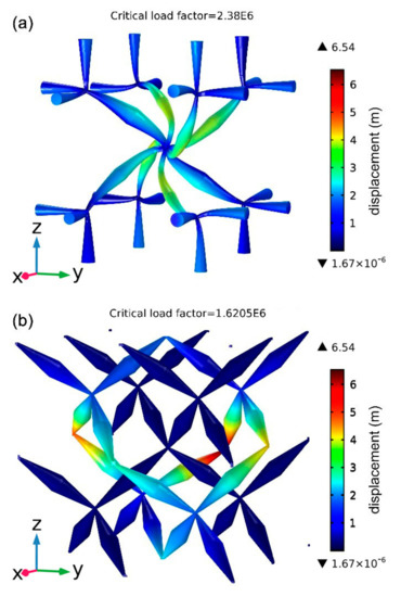 Stability comparison between (a) the new pentamode structure (a = 37.3 μm, D = 2 μm and d = 0.5 μm) in this paper and (b) the classic pentamode structure (a = 37.3 μm, D = 3.05 μm and d = 0.43 μm). The critical load factors are (a) 2.38 × 106 and (b) 1.62 × 106, respectively.