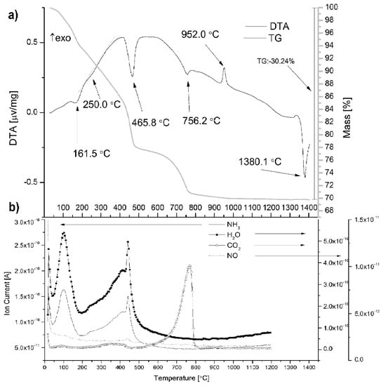 The TG/DTA technique was very useful in the characterization of the thermal behavior of the mayenite precursor mixture. Figure 1a shows the thermal evolution of the temperature range of RT to 1400 °C. Mass spectrometry (MS) results that present ion currents of NH3, H2O, CO2 and NO in gases released from samples during the TG/DTA experiment are additionally shown in Figure 1b.