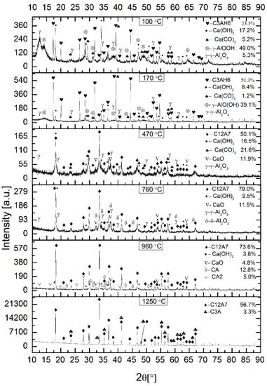 For the sample annealed at 170 °C, there are peaks corresponding to the form of C3AH6, Ca(OH)2, Ca(CO)3, γ-AlO(OH). Aluminium phase with a structure similar to γ-Al2O3 is probably present at this temperature. However, the indexing is difficult due to the low intensity peaks. C3AH6 formation during heat treatment at 161.5 °C in accordance with reaction (1) is marked by the increase in the amount compared to the initial sample of the precursor mixture and the simultaneous increase in the content of boehmite and calcium hydroxide.