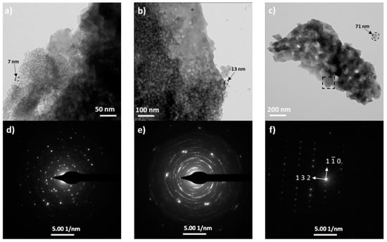 It can be observed that the primary particle morphology is nearly spherical and of uniform size with clear aggregation. The BF image of the sample calcined at 470 °C (Figure 4a) shows that it contains nanoparticles having sizes of ~5–13 nm whereas the powder calcined at 760 °C (Figure 4b) consists of particles of ~10–25 nm in diameter. The primary particles obtained in the lower temperatures show a narrow size distribution. Sinter necks are not observed for the samples sintered at lower temperatures. When raising the calcination temperature for a fixed isothermal time, the grain size of the CA grew significantly. The nanoparticles calcined at 960 °C consisted of large grains such as spheroidal shape particles that the surfaces of several neighboring particles were melted during the procedure due to the high temperature value. Under this condition, the primary crystallites are bonded together by solid bridges (typically formed during the calcination process). The BF micrograph (Figure 4c) reveals the presence of nonuniform aggregates and an internal porosity. Different types of aggregation are marked by a black square in the BF images. The SAED patterns (Figure 4d–f) showing diffuse rings and regular spots which confirms the crystallinity of the powders and is in good agreement with the XRD patterns. The primary particles obtained at lower temperatures turn out a continuous ring pattern due to the presence of a large number of single crystallites in the selected area. However, when the primary particle size increases at higher calcination temperature, the spots are far from each other. The crystal structure analysis using SAED fitted to the cubic crystal structure of mayenite with the I-43d space group and lattice parameters a = 11.982 nm (Figure 4c). It has a narrow particle size distribution ranging between 10.7 and 78.1 nm. The average TEM particle size of the nanocrystallites is shown in Table 1. The observed (sub)micrometric particles by SEM are porous agglomerates of nanometric primary crystallites as confirmed by the TEM studies. At an increasing calcination temperature, a continuous agglomeration of primary particles ensued and when the agglomeration is concluded, the rapid growth of isolated and connected particle was observed. Therefore, at the highest calcination temperature, the pores in the materials are trapped as a result of the sintering.