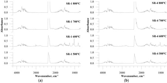 The FTIR spectra of the gaseous product emitted during the reference cross-linked silicone rubber (SR-1) decomposition in the fluidised bed showed the presence of signals originating from CO2 (2250–2400 cm−1), H2O (3500–4000 cm−1; 1300–1900 cm−1), and low molecular organic compounds, primarily aldehydes and aliphatic hydrocarbons (1300–1500 cm−1, 2600–3200 cm−1) (Figure 2a). It is also clearly visible that, at a low temperature, below 700 °C and especially at 600 °C, a signal appears in the spectral range of 800–1300 cm−1 in the form of four bands corresponding to the presence of cyclic siloxanes. The FTIR gas spectra of ceramizable composite reference sample (SR-4) thermal decomposition products (Figure 2b) do not differ significantly from the spectra of SR-1. The main distinction is the presence of additional bands in the range of around 2000-2300 cm−1 at a temperatures over 600 °C. This is due to melamine cyanurate (MC) introduction (in an amount of 30 phr) to ceramizable composites. MC gradually decomposes, first producing ammonia, which is then oxidised to nitrogen oxides, of which N2O (with analytical area of 2000–2222 cm−1) is particularly characteristic. The other difference between the SR-1 and SR-4 spectra can be lowering the absorbance in the range of typical cyclic siloxanes when significant amounts of fillers are introduced into the polymer matrix in the case of ceramizable composites. The introduction of basalt flakes or basalt fibres to the composites did not substantially alter the spectra, thus these spectra were not shown. Nevertheless, the computer software performed deconvolution of each spectrum obtained during the experiments and enabled one to qualitatively compare the influence of these fillers on the emission and the toxicity of silicone rubber composites.