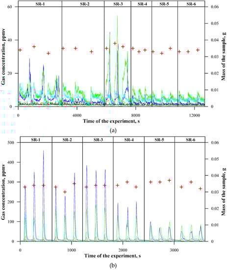 At a temperature of 500 °C (Figure 3a), the thermal decomposition of cross-linked silicone rubber (SR-1) resulted in the maximum instantaneous emission at the level of approximately 30 ppmv CO, 20 ppmv aldehydes, and approximately 15 ppmv methane. The instantaneous concentrations of cyclic siloxanes and NMHCs (non-methane hydrocarbons) did not exceed 5 ppmv. An addition of basalt flakes resulted in a decrease in instantaneous concentrations of CO and a simultaneous increase in instantaneous concentrations of cyclic siloxanes. This might indicate that the process of thermal decomposition (inhibition of the step of the decomposition of cyclic siloxanes) was slowed down by large surface particles. This is also confirmed by an increased time of the process of thermal decomposition of the samples SR-3. The sample containing basalt fibres (SR-3) demonstrated a different behaviour during thermal decomposition. Its decomposition time was approximately two times shorter than that of the reference sample, which led to the fact that the registered concentrations in flue gases of this composite were high (maximum approximately 40 ppmv CO, approx. 50 ppmv aldehydes, and approx. 5 ppmv cyclic siloxanes). This might indicate an indirect initiation of the processes of silicone rubber thermal decomposition by long basalt fibres. The fibres probably caused accelerated breaking and dividing the samples into smaller fragments, which resulted in a considerable increase in the surface of mass and heat transfer in the process.