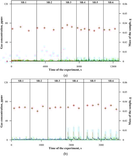 An increase in the temperature of the thermal decomposition process to 600 °C (Figure 3b) resulted in a significant increase in its rate. This reduced the differences between particular composites, both in terms of the decomposition time and the concentrations of gaseous products resulting from their decomposition. The intensification of thermal decomposition contributed to a significant emission of the undesired compounds. This is the temperature of maximum instantaneous emission of aldehydes (approx. 150 ppmv for SR-1, SR-2, and SR-3), methane (approx. 100 ppmv for SR-1), as well as cyclic siloxanes (approx. 20 ppmv for composites without ceramizable additives). An addition of the basalt filler in the case of ceramizable composites resulted in a reduction of the instantaneous concentrations of CO, and also to a lesser extent of aldehydes and methane. The fact that the concentration of cyclic siloxanes does not increase may indicate accelerated decomposition of the samples SR-5 and SR-6 with reference to SR-4 as well as indirect catalysing of the oxidation process of CO to CO2 by basalt fillers.