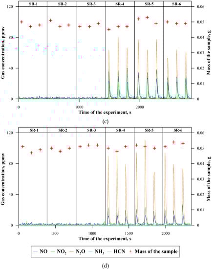 Concentrations of nitrogen compounds emitted during thermal decomposition of silicon rubber composites: (a) at 500 °C; (b) at 600 °C; (c) at 700 °C; and, (d) at 800 °C.