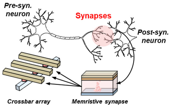 The implementation of electronic synapses is nowadays one of the challenges of hardware-based neuromorphic engineering, which aims to design electronic circuits with a similar architecture and behavior to the one found in biological brains. Within this context, the conductivity of an electronic device with memristive characteristics is identified as the weight or strength of a connection between two neurons (Figure 1), usually within a crossbar array which implements the synaptic matrix layer of an electronic neural network (Figure 2a). An analog behavior of the electronic synapse is desirable to improve the robustness of the network [1,2,3], showing a large window between its higher and lower conductivities and displaying many accessible conductivity levels in between. The conductivity of an analog synaptic device is then finely tuned according to some learning rule during the training stage of a learning algorithm. Among the different technologies that have been proved to be suitable for synaptic applications, the oxide-based resistive random access memory (OxRAM) technology stands out when analog conductivity changes are required [1,2,3,4,5,6,7].