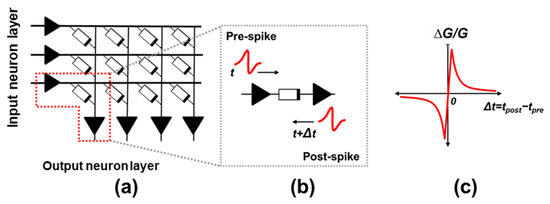 The synaptic weight updating process is therefore the basis for the application of any learning algorithm in a neural network, and is related to the capability of the synapse to adapt its conductivity through experience, namely its property of plasticity. In the case of electronic synapses, this feature involves the modulation of the conductivity (G) of an electronic device, where changes (ΔG) can be induced by applying the appropriate voltage drop between its two terminals (Figure 2b). These updates in the conductivity of the device are applied according to the recent activity of the neurons it connects. For instance, temporal correlations and causality between the recent activity of the input and output neurons can determine the magnitude and direction of the relative synaptic weight change, ΔG/G. The so-called spike-timing dependent plasticity (STDP) has been reported in biological systems [8,9,10,11,12,13,14,15,16], and is a popular bio-inspired learning rule implemented in artificial neural networks and computational neuroscience [10,11,12,13,14,15], where ΔG/G is described as a function of the time delay Δt between the pre (input) and post-synaptic (output) neurons spike firing, respectively (Figure 2c). The nature of the synaptic change is what depends on the causality between the input and output neurons activations.