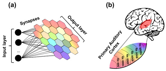 Once trained, these networks present topographical organization such as the one found in sensory processing areas of the brain, such as the tonotopic map found in the primary auditory cortex, in charge of processing sound (Figure 3b). In here, the neurons that respond to similar sound frequencies are grouped in clusters, which appear in a frequency-ordered fashion. In this way, similar inputs activate neurons in the output layer which are found close to each other, whereas dissimilar ones affect distant regions [22,25,26,27]. The output layer neurons in a trained SOM appear organized in clusters, whose relative size and location provides statistical information of its corresponding input data item characteristics. It is actually the presence or absence of an active response of an output neuron cluster, and not so much the exact input–output signal transformation or magnitude of the response, that provides an interpretation of the input information [22,23,24].