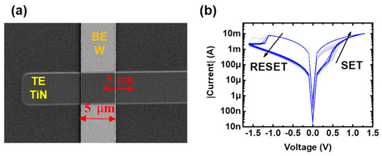 (a) SEM image of the tested structure (b) Experimental I-V characteristics of the analyzed devices [29]. A voltage limit for the RESET process was set to −1.6V, whereas for the SET process, the conductivity-controlling parameter was the maximum current driving the device (current compliance, Ic) set by the user.