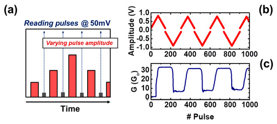 (a) Stair-case pulse-programming scheme used in [29] for obtaining the G–V characteristics of a memristive device. (b) The pulse amplitude was increased and decreased over time to change the device conductivity. (c) Conductivity G as a function of the applied pulses.