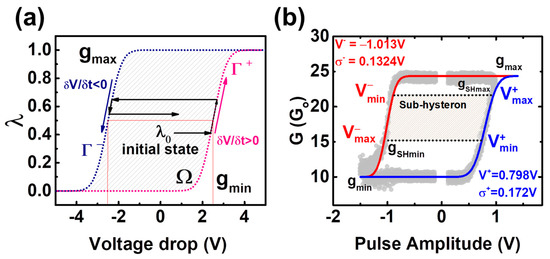 By means of representing the obtained experimental conductivity as a function of the applied voltage, the experimental the G–V characteristics can be fitted according to the compact model of [32]. In here, the so-called hysteron function is used to describe a time-independent conductivity window as a function of the applied voltage in non-linear memristive devices. An example of an ideal hysteron function of a non-linear memristive device is depicted in Figure 6a. The normalized internal state λ is represented as a function of voltage drop at the memristor. The top and bottom boundaries are identified as the maximum (gmax) and minimum (gmin) conductivity states. In order to increase (decrease) the conductivity state of the device, a positive (negative) voltage has to be applied so that λ shifts towards gmax (gmin), describing the Γ+ (Γ−) trajectories. The pair of logistic ridge functions Γ+ and Γ− can be modeled with two cumulative distribution functions (cdf) [29], related to the pulse amplitudes applied to the non-linear memristive device, being V+, σ+ and V−, σ− the average and standard deviation values of the cdf related to Γ+ (for dV/dt > 0) and Γ− (dV/dt < 0) curves, respectively. Both of them define the boundaries of the possible conductivities of the device within a range limited by the minimum and maximum conductivity states, gmin and gmax, respectively.