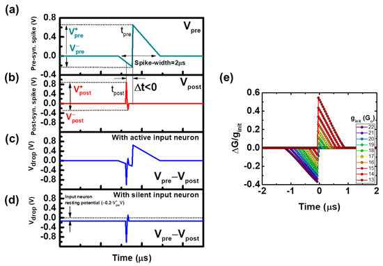 Pair of proposed pre (a) and post-synaptic (b) waveforms. Resulting voltage drop waveform applied to the sample for an active (c) and silent (d) pre-synaptic (input) neuron. (e) Balanced STDP function. Each curve corresponds to a different initial conductivity state of the same device.