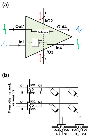 For simplicity, a system with a single synaptic layer is considered in this work. The neuron behavior was included mathematically. Implementations of the designs of electronic neurons based in CMOS technology can be found in [34,35]. In the case of a single synaptic layer system, such as the one depicted in Figure 9b, the input neurons of the system are in charge of triggering voltage pulses through terminal Out4 according to the input dataset (signaled via In1), sourcing or draining current from/to the synaptic layer, and have the integrate function disabled, as well as the neighbor interaction. Output neurons integrate the received current through terminal In1, which corresponds to the summation of each of the input neurons voltage pulse, weighted by its connection weight or device conductivity. These output neurons fire a post-synaptic pulse backwards, as a response to the input neurons activity if their accumulated charge reaches the charge threshold, and also communicate with their immediate neuronal neighbors within the output layer via terminals I/O2 and I/O3. Its activity is measured through Out4. Finally, its terminal In4 is left unconnected.