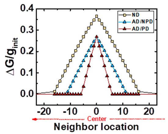 The implementation of a neighborhood interaction function whose amplitude decays laterally is often used in the software versions of the self-organizing networks (Figure 10). This is motivated by both anatomical and physiological evidence of the way neurons in nervous system interact laterally. The most popular choices for this function include a rectangular (abrupt) interaction function, Gaussian (a soft transition) or the so-called Mexican hat function, which consists in a soft transition involving the inhibition of the outermost neurons within the neighborhood. In our case, the decaying amplitude of the neighborhood interaction function is inherent to our system, because of the implementation of the above described STDP function as a local learning rule. Despite the neighbors of the maximally responding output neuron are intended to fire an identical pulse, this pulse will be delayed in comparison with the response of the main responding neuron (center of the neighborhood). With increasing Δt, the induced ΔG/G will also decay with increasing lateral distance, as shown in Figure 10. The radius or number of affected neighbors can be set externally by controlling the time delay: the whole neighborhood activity can be delayed (all delayed, AD), and the propagation delay (PD) between immediate neighbors.