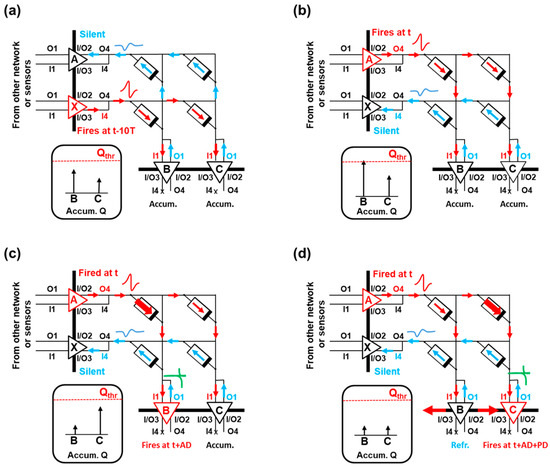 A sketch of the operation of the 2 × 2 crossbar array with active and silent neurons, where all of these signals are indicated, is shown in Figure 11. In here, the arrows indicate the current flow in the system. The accumulated charge of the output neurons is also depicted. The input neuron layer consists on neurons A and X, whereas the output neuron layer consists on neurons B and C. In Figure 11a, input neuron X fires a pulse through Out4, and input neuron A remains silent. These signals update the accumulated charge of the output neurons B and C. In Figure 11b, input neuron A fires a pulse, and output neuron B accumulated charge reaches the charge threshold, Qthr. In Figure 11c, the accumulated charge of B is reset, and B fires a pulse delayed by a certain delay AD with respect to the firing time of input neuron A. The voltage drop at the synapses within the B column causes a change in their synaptic weights. Then, neuron B communicates with its neighbors (only neuron C is depicted). Finally, in Figure 11d, neuron C triggers a pulse with increased time delay with respect to the firing time of A, AD + PD, and its accumulated charge is reset. Because its pulse presents a larger time delay, the magnitude of the change of its synapses will be smaller, according to the induced STDP function.