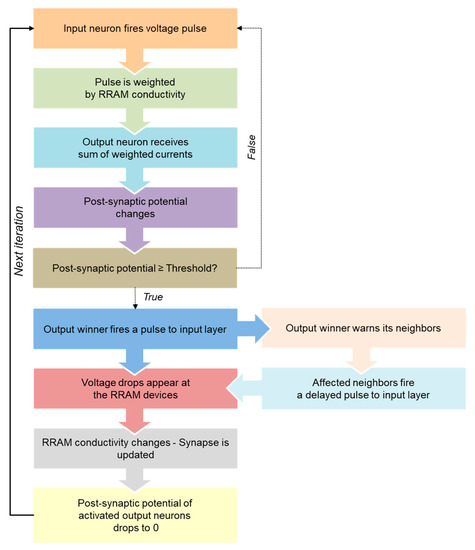 The whole training stage is summarized in the flow diagram depicted in Figure 12. Initially, all of the devices are assumed to have a random conductivity around 15–18Go in our case. The output neurons membrane potentials are also initialized to zero. The input dataset is then fed to the system through the input neurons, which are triggering the pre-synaptic voltage waveform depicted in Figure 8a if active, or applying their resting potential (small negative voltage) to the synaptic array, if silent (as shown in the sketches of Figure 11a,b). The output neurons potentials increase as the output neurons integrate the pulses of the input neurons that they receive, which are weighted by the conductivity of the synaptic devices. That is, the output neurons are receiving a charge whose magnitude is related to the input activity and the weight of the connections between each of them and the input layer. Eventually, one of the output neurons potential will reach the defined charge threshold Qthr. At this point, the weight updating process occurs: the output neuron resets its accumulated potential to zero, and triggers the post-synaptic voltage waveform from Figure 8b backwards, affecting its synapses (Figure 11c). The maximum voltage drop given by this post-synaptic voltage pulse and the active input neuron corresponds to the sum of V+pre and V−post (positive Δt), so this particular synapse is strengthened. On the other hand, the synapses with silent input neurons are depressed, being their voltage drop equal to the sum of V+pre and the input neurons resting potential, which is a DC voltage of 0.2·V+pre V. Therefore, the induced conductivity change in these synapses has a smaller magnitude in comparison with the one induced to the synapse that connects the winning output neuron with the active input neurons. After the weight updating of the main neuron has been executed, its activity is propagated through the output layer, affecting its immediate neighbors. These other output neurons trigger a voltage pulse with the same amplitude, but with a certain accumulated delay (Figure 11d). That is, the magnitude of the change in the strengthened synapses will be decreasing as the output signal propagates through the output layer, until reaching a non-significant synaptic change, following the neighbor interaction function of Figure 10. The affected neighbors will also reset their output potential to zero.