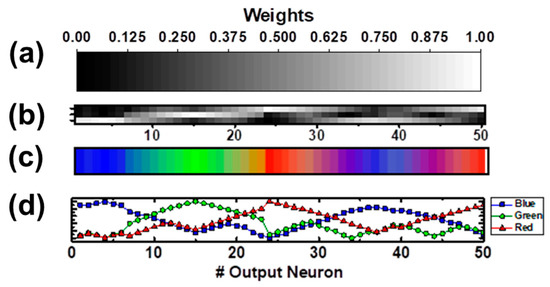 Through the iterations, the system is able to self-organize in an autonomous way, without any intervention, being a fully-unsupervised training scheme. After the training stage, the memristors in the column of every neuron within the output layer have a different synaptic weight combination, according to the conductivity states found in the memristors’ column of the output neuron. An example of the obtained topographical pattern is depicted in Figure 13. In particular, Figure 13a displays the gray-scale used to represent the synaptic weights of Figure 13b, which are normalized according to the maximum and minimum conductivity values found in the sub-hysteron region of Figure 6b. The highest conductivity states, depicted in white, correspond to 21Go, whereas the lowest ones in black correspond to 13.5 Go, being within the defined range of gSH (13–22Go). Figure 13b is a representation of the simulated crossbar array after the training, where the synaptic weights are depicted according to the above mentioned gray-scale. The size of this matrix is of 3 × 50 (3 rows and 50 columns), corresponding to the number of input and output neurons, respectively, which are not shown in this representation. It can be seen that, in each of the three rows of the matrix, the synaptic weights increase and decrease gradually. The synapses with the highest synaptic weights of the three rows are located in different regions of the crossbar array, corresponding to the 24th and 50th output neurons in the case of the first row, to the 15th for the second row, and lastly, to the 46th for the third row. The first row of synapses was connected to an input neuron representing the red color component, whereas the second and the third rows were connected to input neurons representing the green and the blue color components, respectively. Then, nearby output neurons appear to have similar colors components assigned, as expected. Hence, groups of output neurons sensitive to one of the primary colors used during the training stage can be identified.