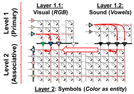 By means of adding computing layers to a self-organizing neural network such as the one presented in this work, hierarchical computation can be achieved. Figure 14 displays an example of a hierarchical SOM system, where the first synaptic layers are constituted by SOMs, such as the color-mapping SOM presented in this work (Layer 1.1), which can also be trained with audio data (Layer 1.2) as to classify the sounds of English vowels. This primary level of the hierarchy (Level 1) pre-processes the information to be fed to higher-order levels, where an associative process between colors and sounds takes place in another SOM, located in Level 2. In other words, the hierarchy permits to develop more complex data structures involving not only the self-organizing property, but also associative learning, which can be summarized as the ability to correlate different memories to the same fact or event [38]. This would represent a step forward towards reproducing complex neural processes and biologically-plausible learning mechanisms in neuromorphic architectures [38].
