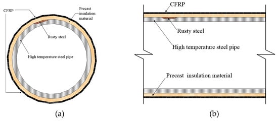 The proposed strengthening method for high-temperature steel pipe. (a) Lateral cross-section; (b) Longitudinal cross-section.