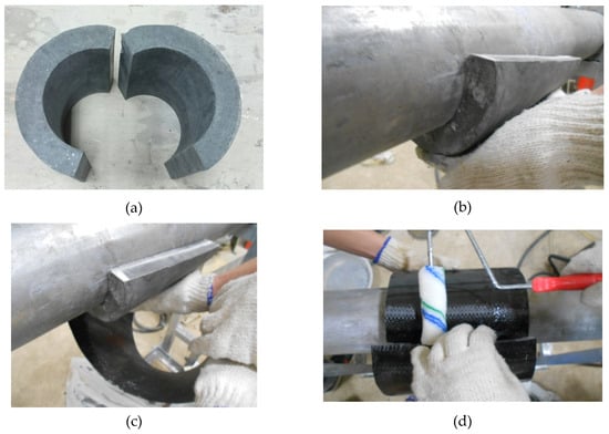 The procedure scheme for rehabilitation method of the high-temperature used pipeline. (a) Precast C-shaped insulation material; (b) The pipeline was covered by two C-shaped precast insulation material; (c) The C-shaped insulation material was wrapped by carbon fiber reinforcement plastic (CFRP) jacket; (d) Epoxy resin was used as an adhesive to fasten the CFRP jacket.
