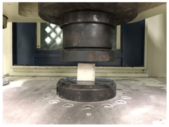 The compressive strength test of the specimen with the dimensional aspects of 5 mm × 5 mm × 5 mm standard cubic specimens performed according to ASTM C109/C M109-02 [24]. This test program was undertaken by the 100 tf universal-testing machine at the material laboratory of the Department of Civil Engineering, National Taipei University of Technology. The illustration photo of compression test for cubic specimen is shown in Figure 3.