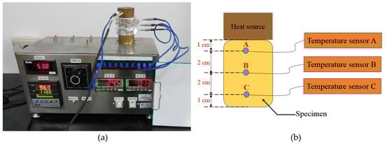 Illustration of the thermal conductivity test (SUS304, Xiwnag Jiazu LTD., Kaohsiung, Taiwan). (a) Thermal conductivity test setup; (b) Thermal conductivity test specimen.
