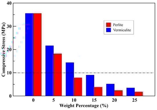 The relationship diagram between compressive strength and the content of perlite or vermiculite (by percentage weight) mixed with magnesium phosphate cement (MPC).