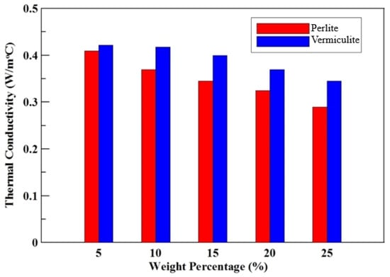 - The compressive strength of the specimen mixed with perlite powder decreased from 35.6 MPa to 1.73 MPa, and thermal conductivity of the specimen decreased from 0.428 W/(m°C) to 0.295 W/m℃ by increasing the perlite powder ratio from 0% to 25%. Similarly, the compressive strength of the specimen mixed with vermiculite powder decreased from 35.6 MPa to 3.5 MPa; and thermal conductivity of the specimen decreased from 0.428 W/(m°C) to 0.344 W/(m°C) by increasing the amount of the additional vermiculite ratios from 0% to 25%. Therefore, as the perlite or vermiculite powder ratio increases, the compressive strength and thermal conductivity of the specimen will decrease.