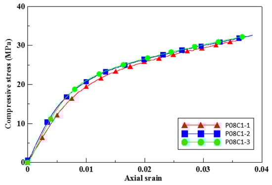 Three strain gauges were mounted on the top, middle, and bottom of each insulation material cylinder wrapped with CFRP composite material; and the lateral strains of the insulation material cylinder were measured. Since the deformation of the insulation material cylinder was not uniform, the measured strains exhibited variability. Figure 8 is the stress–strain curves of the specimens P08C1, when the stress reaches 16 MPa, the stiffness begins to decrease. When the stress reaches ultimate strength, the specimen produced a huge burst sound when on its failure. The failure photos of specimen P08C1 were shown in Figure 9.