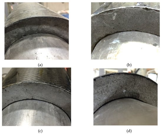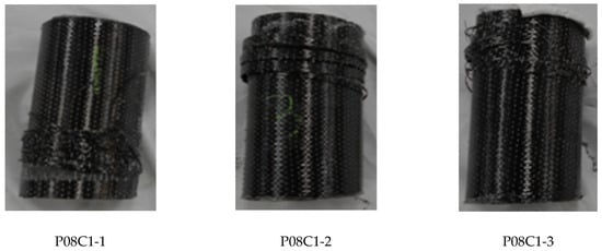 Specimen P25-25 was chosen for the first experiment, specimen P25-25 had the content of 25% perlite with the C-shape precast insulation material of 25 mm-thick. When the steel pipe was heated up to 200 ℃ for 17 hours and the heating system stay in steady state; the surface temperature of CFRP is about 85 ℃. The temperature difference between the steel pipe and CFRP surface is 115℃ due to the insulation effect of C-shaped insulation material. The C-shaped insulation material was removed after the steel tube cooled to room temperature; few hairline cracks were observed in the specimen P25-25 owing to the thermal impact. However, CFRP composite material was completely undamaged; the observation image of the specimen P25-25 as shown in Figure 12 although the fracture texture only occurs with few hairline cracks after the thermal experiment. As seen in Figure 12a–c, specimen P08-25 and P15-25, the experimental results were similar to the results of specimen P25-25, except for the temperatures on the CFRP surface. The reduced temperatures of the specimens with different perlite ratios are shown in Table 9. As seen from experimental results of a greater reduced temperature value, the high temperature using pipelines decreased thermal damage in a higher composition of the perlite ratio of the C-shaped insulation materials and, therefore, it had a stronger reinforced capability.
