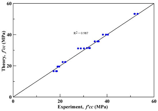 From the regression analysis, this study obtained a = 16 and b = 7. The experimental and proposed theoretical compressive strengths of the insulation material are shown in Figure 10; and the square of the correlation coefficient () is 0.987. As shown in Table 7, the average absolute error of the compressive strength between experimental data and the proposed theoretical formula is 3.33%. The proposed formula can accurately predict the compressive strengths of the specimen with the confined insulation material.