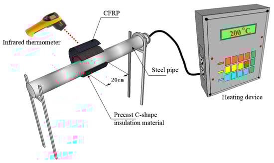 A copper-headed heating rod was put into a stainless steel tube with an outer diameter of 11.4 cm and a length of 100 cm, and the stainless steel tube was heated by a heating device to simulate high-temperature pipeline. The temperature record of the CFRP on its surface was measured by an infrared thermometer. The experimental equipment installation for the high-temperature pipeline maintenance method is shown in Figure 11.