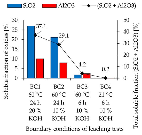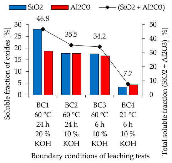 For metakaolin, a significantly higher amount of SiO2 gets dissolved, when a higher concentrated potassium hydroxide solution is used (BC1: 60 °C; 24 h; 20% KOH), compared to the dissolved Al2O3. For BC2 (60 °C; 24 h; 10% KOH) and BC3 (60 °C; 6 h; 10% KOH), the total soluble fraction decreases from 46.8% (BC1) to 35.5% (BC2) resp. 34.2% (BC3). In contrast to BC1, however, BC2 and BC3 have approximately the same amount of dissolved SiO2 and Al2O3. Changing the temperature from 60 °C to 21 °C (BC4: 21 °C; 6 h; 10% KOH), the total soluble fraction decreases significantly. The dissolution of Al2O3 is, apart from BC4, almost constant under all boundary conditions. Only a slight decrease in values towards weaker boundary conditions could be observed.