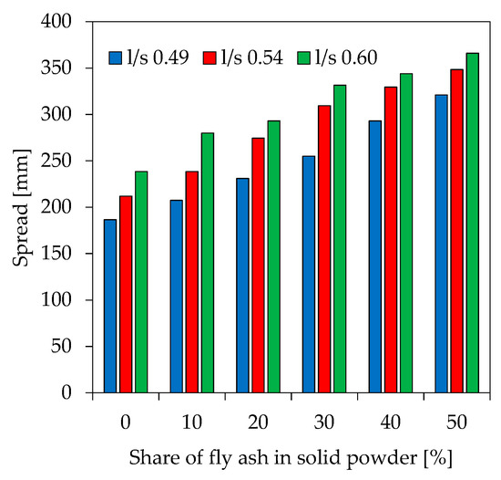 Workability of the pastes show a clear trend towards higher spreads with increasing l/s ratios and higher fly ash contents (Figure 3). Mixtures with l/s 0.49 have a spread in the range of 187 mm to 321 mm, 212 mm to 349 mm for l/s 0.54 and 239 mm to 366 mm for l/s 0.60, respectively. For the three different l/s ratios this results in almost linear correlations with coefficients of determination (R2) of 0.97 (l/s 0.49), 0.99 (l/s 0.54) and 0.99 (l/s 0.60).