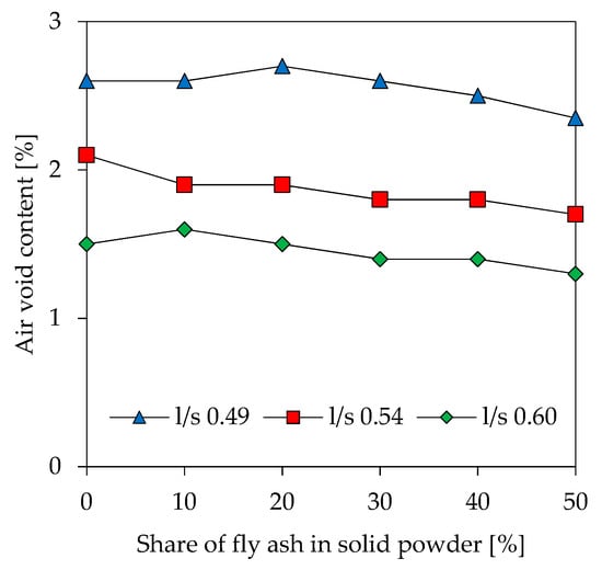 Air void content of fresh pastes shows lower values when l/s increases (Figure 4). For l/s 0.49 the air void content is between 2.4% and 2.7%, resp. 1.7% to 2.1% for l/s 0.54 and 1.3% to 1.6% for l/s 0.60. For geopolymer blends with the same l/s value no significant differences were found with differing fly ash contents.