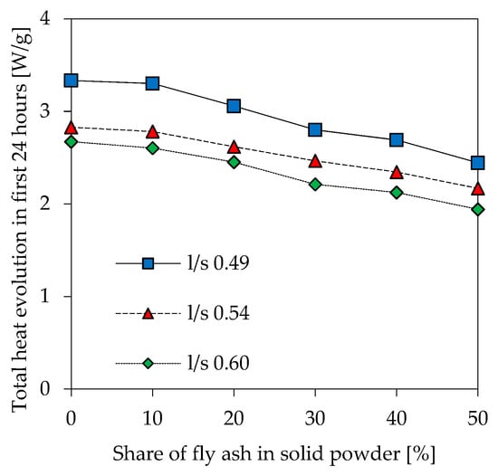 The heat evolution of all 18 geopolymer formulations reaches its maximum within the first 5 minutes of reaction. Total heat evolution within the first 24 h of reaction (Figure 5) shows a trend towards lower values for increasing l/s ratio and higher amounts of fly ash. The graphs for l/s 0.54 and l/s 0.60 are close to each other, whereas the lowest l/s ratio (0.49) results in a more pronounced difference of the total heat, especially for lower fly ash contents.