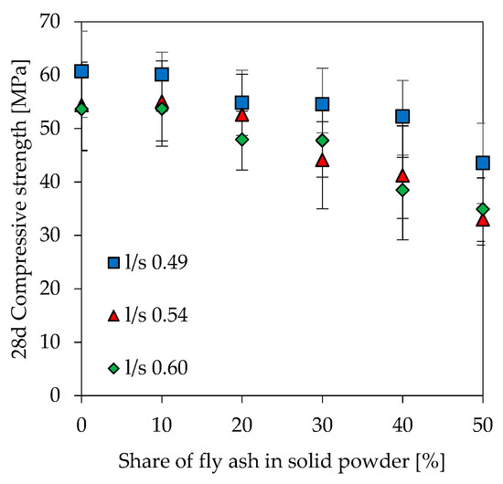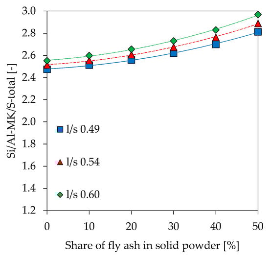 In the present study, the negative influence of fly ash and higher l/s ratios on early and “final” strength after 56 days (see Figure 7) will probably superimpose the effect of Si/Al ratio. Si/Al ratios in this paper are measured by SEM-EDS and also calculated by taking into account different material compositions, which clearly show that both a higher fly ash content as well as increasing l/s ratios result in a lower strength, although the Si/Al ratios increase (see Figure 14). The more moderate but pronounced strength increase at higher fly ash contents is a known fact in cementitious systems, which is due to low reactivity of fly ash. In this context, however, higher strength with higher fly ash amounts can only be achieved when using reduced l/s ratios.