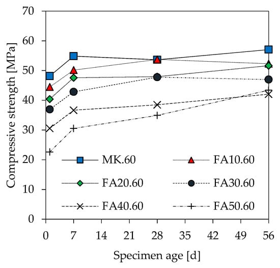 Higher amounts of larger pores for geopolymers with increasing fly ash content were also mentioned by Zhang et al. [41] as well as the increase off total porosity. However, the change in pore size distribution in the present study is much more pronounced (see Figure 8, Figure 9 and Figure 10), which may result from the high amount of quartz in metakaolin and its, therefore, lower water demand compared to the metakaolin used by the aforementioned researchers. Correlating total porosity and pore size distribution to the compressive strength, also for 28 day old specimens, is ambiguous, but may be assumed in some cases. Comparison of MK.60 and FA10.60 shows that total porosity and pore size distribution is almost identical (see Figure 10) as well as the compressive strength (see Figure 7). The same statement can be made for geopolymers FA20.60 and FA30.60. The obvious change in pore size distribution at the transition from 20% to 30% fly ash is also reflected in the results of the compressive strength. The influence of Si/Al ratio, therefore, could be little or superimposed by the influence of total porosity and pore size distribution, although Si/Al-EDS shows differences for both cases (MK.60 compared to FA10.60 and FA20.60 compared to FA30.60). Furthermore, it is noticeable that the Si/Al-EDS values at the transition from 20% to 30% fly ash also show a sizeable increase of the values, which was mentioned before for the pore size distribution.