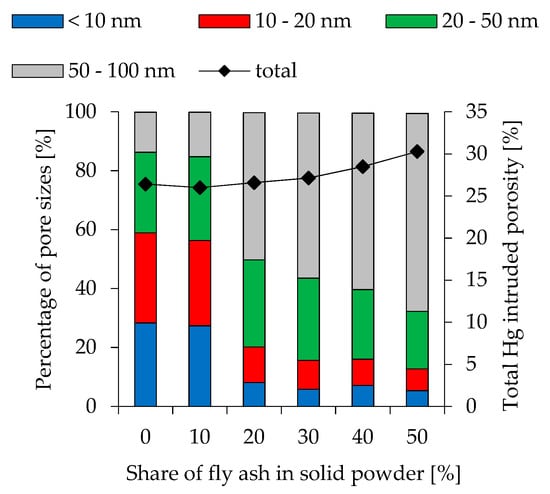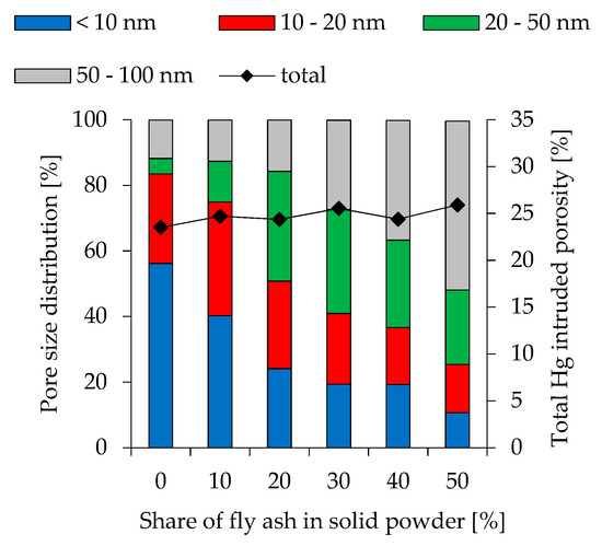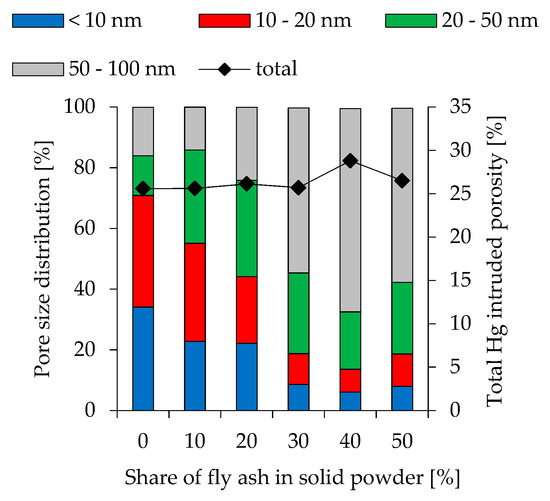 To show the effect of changing pore size distribution at different fly ash contents and various l/s ratios, Hg intruded pores obtained by Mercury intrusion porosimetry (MIP) are divided into 4 different orders of magnitude (< 10 nm, 10 nm–20 nm, 20 nm–50 nm and 50 nm–100 nm). The results are presented in Figure 8 (l/s 0.49), Figure 9 (l/s 0.54) and Figure 10 (l/s 0.60), including also the total Hg intruded porosity. In addition to MIP, water adsorption tests were performed (see Figure 11) to evaluate the capillary porosity.